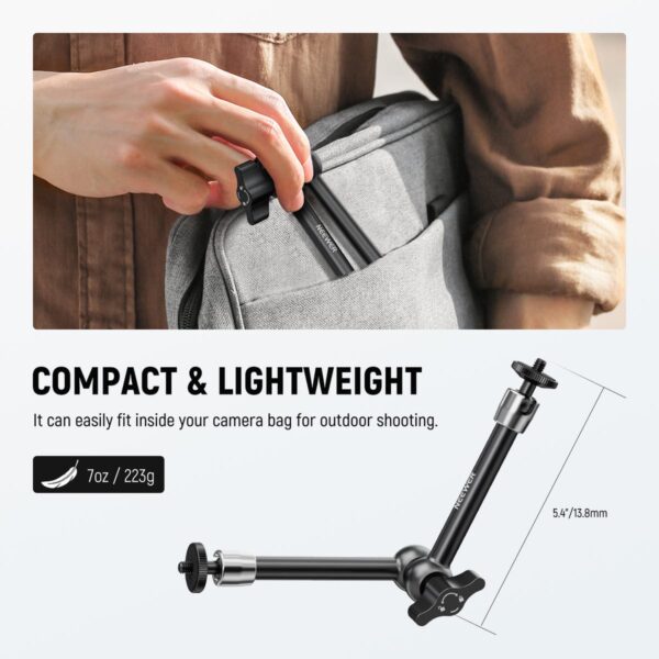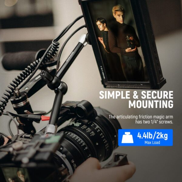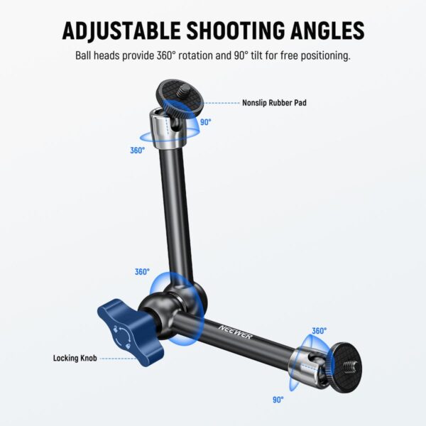 Crafted for filmmakers, photographers, and rig builders, the Neewer ST25 9.8-inch Magic Arm is a highly flexible accessory that lets you mount and position lights, monitors, mics, or other gear at almost any angle. Made of sturdy aluminium alloy, it’s lightweight yet rugged enough for outdoor use, resisting rust and deformation when used in various environments. The arm features three joint points — two ball heads plus a central rosette — allowing full 360° articulation and precise angle control.
